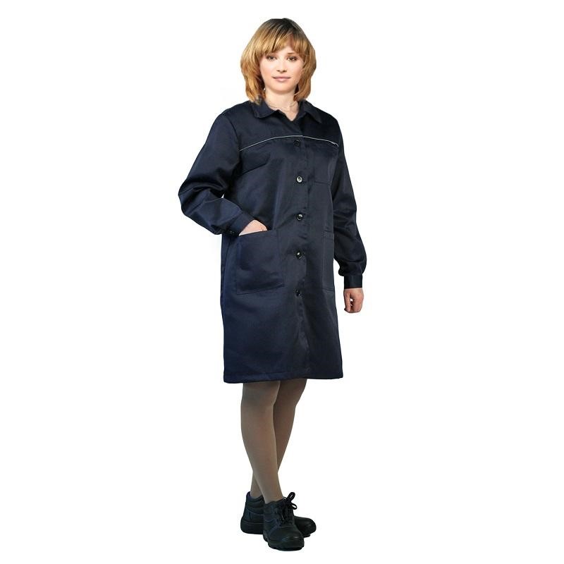 Халат женский рабочий предназначен для защиты от загрязнений общепроизводственного характера и от механических воздействий. Применяется для выполнения работ сотрудницами цехов, фабрик и производств различных отраслей легкой промышленности, складских и сервисных центров, а также для технического персонала. Материалом верха служит смесовая ткань плотностью 210 г/м², состоящая из 20% натурального хлопка и 80% полиэстера. Такая ткань обладает прекрасными прочностными качествами, а также, благодаря наличию натуральных волокон, имеет хорошие вентиляционные качества. Модель халата дополнена светоотражающим кантом, проходящим кокеткам полочки и спинки, что придает изделию сигнальные свойства при эксплуатации в условиях плохой видимости. Женский рабочий халат выполнен в удобном свободном фасоне с отложным воротничком и центральной застежкой на петли и пуговицы. Рукава изделия выполнены с манжетами и застегиваются на пуговицы, что обеспечивает дополнительный комфорт в эксплуатации и защищает от попадания внутрь различных загрязнений. По спинке изделия имеется шлица, позволяющая придать дополнительную свободу движений. Халат оснащен тремя удобными накладными карманами: двумя боковыми и одним нагрудным.
