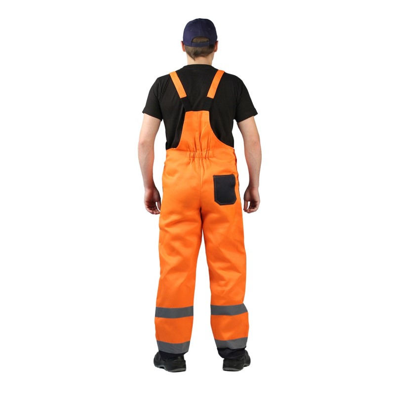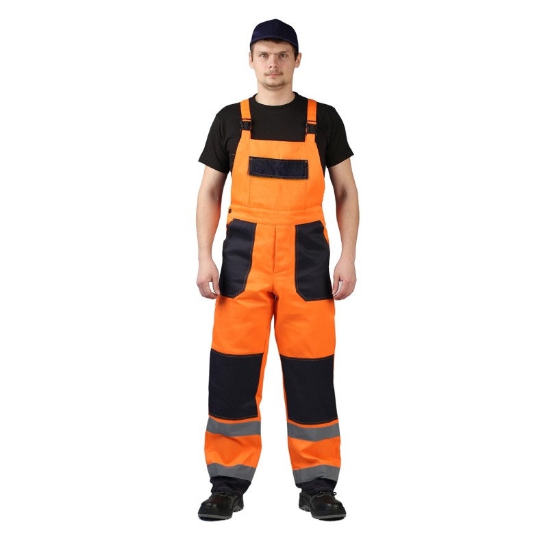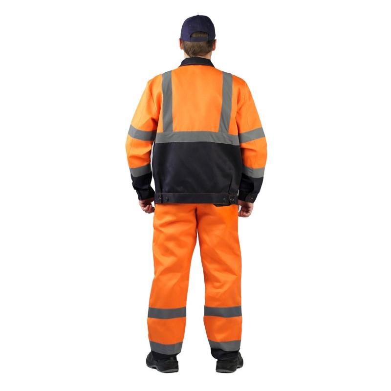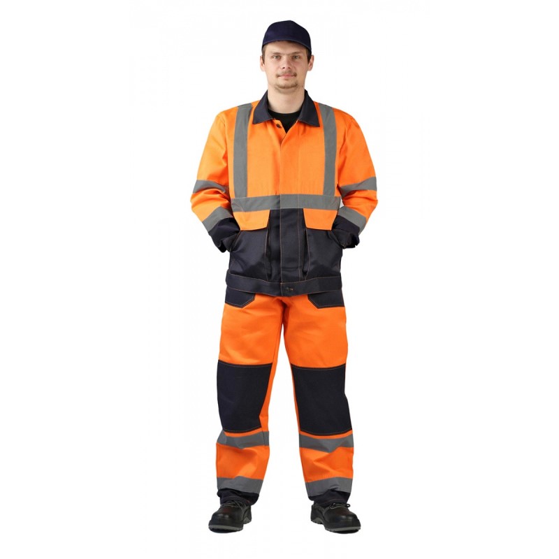 Облегченный мужской рабочий костюм, обладающий сигнальными качествами, предназначен для использования в строительно-монтажной, ремонтной отрасли, муниципальными, дорожными и коммунальными службами в качестве защитной спецодежды от механических повреждений и общепроизводственных загрязнений. Костюм выполняется из смесовой ткани (натуральный хлопок + полиэфир) специального саржевого переплетения, плотностью 210 г/м². Такая ткань обладает превосходными прочностными качествами, устойчива к истиранию, долговечна, а, благодаря наличию волокон хлопка, безопасна, хорошо проводит воздух, гигроскопична и гипоаллергенна. Защитный комбинезон состоит из куртки и полукомбинезона и рекомендуется к эксплуатации в летний либо демисезонный период. Сигнальные качества 3-го класса защиты получаются за счет комбинирования при изготовлении ярких контрастных тканей и светоотражающих полос (СОП) шириной 50мм. На куртке СОП расположены вертикально и горизонтально по спинке и полочке изделия, а также двух рядно в локтевой области рукавов. Полукомбинезон оснащен СОП по низу брючин и в области коленей. Куртка костюма укороченной модели, с центральной потайной застежкой на пуговицы. Пояс куртки притачной и регулируется по объему патами на пуговицах. Для защиты от пыли и загрязнений предусмотрены манжеты на рукавах и плотно застегивающийся отложной воротничок. Куртка оснащена четырьмя крупными накладными карманами, с клапанами на липучке. Два объемных нагрудных кармана и два вместительных боковых с косым входом. Полукомбинезон прямого свободного покроя дополнен высокой грудкой и спинкой, для защиты от механических воздействий. Эластичная тесьма со стороны спинки служит для комфортной посадки по фигуре. Бретели оборудованы фастекс — застежкой и дополнены эластичной лентой. Область коленей дополнительно усилена защитными накладками. Имеется объемный нагрудный накладной карман, а также два контрастных боковых.
